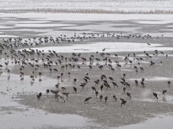 4月5日清明时节,吉林镇赉莫莫格湿地迎来降雪。漫天飞雪中,白鹤、黑尾塍鹬、灰鹤等珍稀候鸟悠然觅食、翩跹起舞,勾勒出“中国白鹤之乡”生机盎然的生态图景。
